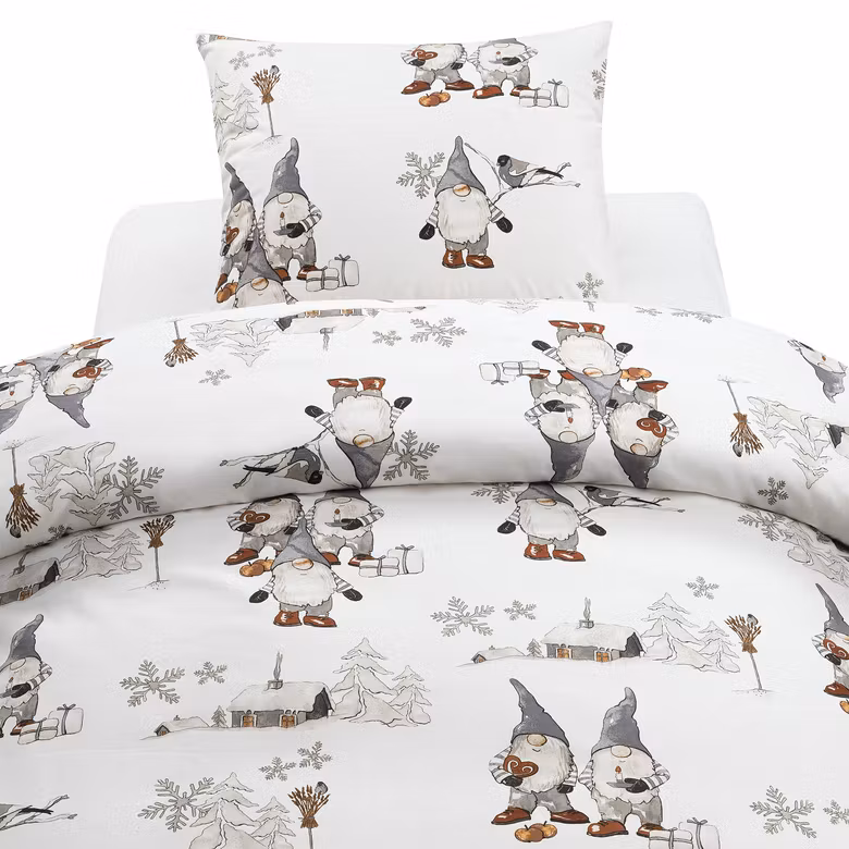Detta lekfulla och gulliga bäddset pryds av söta små jultomtar i sina grå luvor omgivna av snötyngda granar mot en ren vit bakgrund – en design som genast sprider värme och julglädje i hemmet.