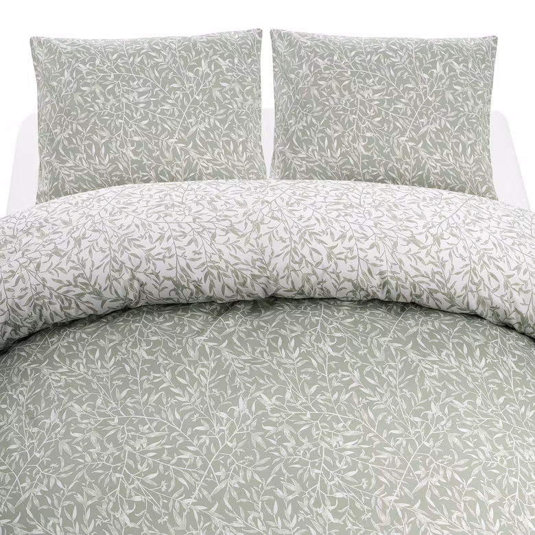 Det dubbelsidiga påslakanet erbjuder två vackra sidor med naturliga bladmotiv i grönt och vitt – perfekt för dig som vill kunna förändra känslan i sovrummet med enkelhet.