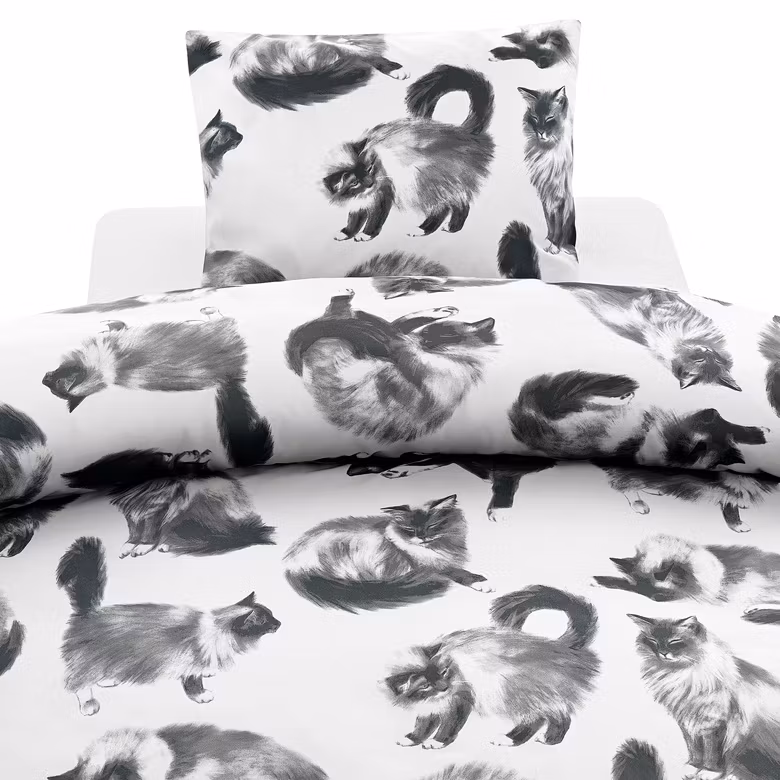 Detta stilrena och mysiga 2-dels påslakanset pryds av ett gulligt kattmönster i gråskala på vit botten – perfekt för alla kattälskare som vill ha sällskap även i drömmarna.