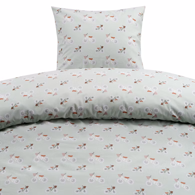 Detta härliga påslakanset har ett charmigt cykelmönster på ljusgrön botten, som sprider glädje och liv till rummet. Den ljusa gröna färgen skapar en fräsch, lugn och harmonisk atmosfär, samtidigt som det humoristiska motivet tillför en personlig och lättsam karaktär.