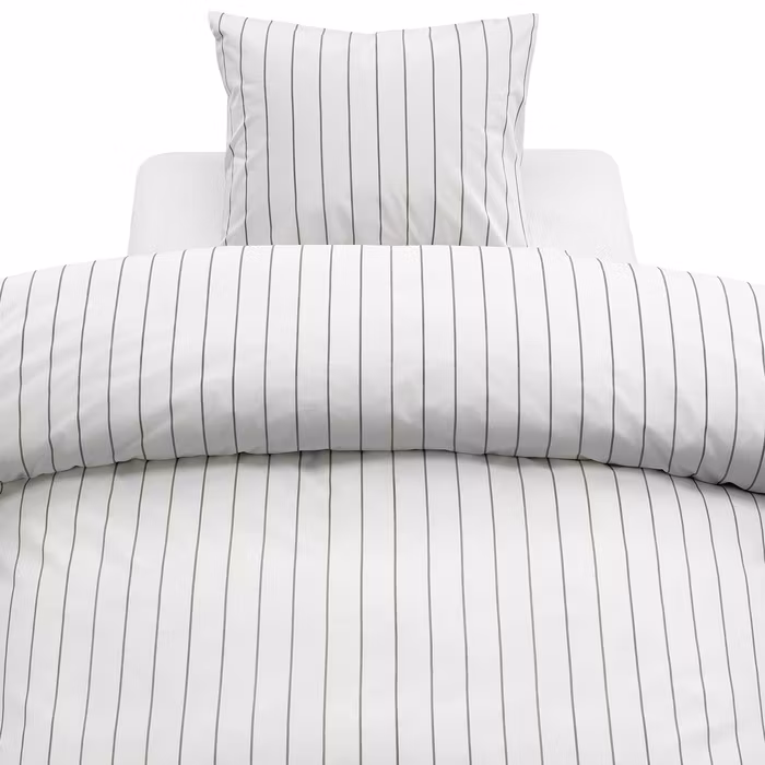 Detta klassiska påslakanset har smala lodräta ränder i en harmonisk grön nyans mot en vit botten, vilket ger en elegant kontrast och en lugn, inbjudande känsla.