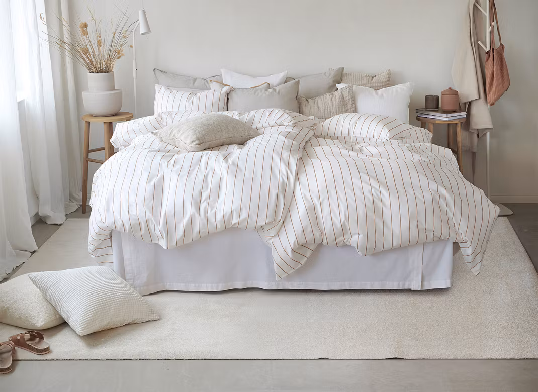 Med sina smala rostfärgade ränder mot vit botten ger det en klassisk men modern känsla som förvandlar sovrummet till en varm och välkomnande plats.