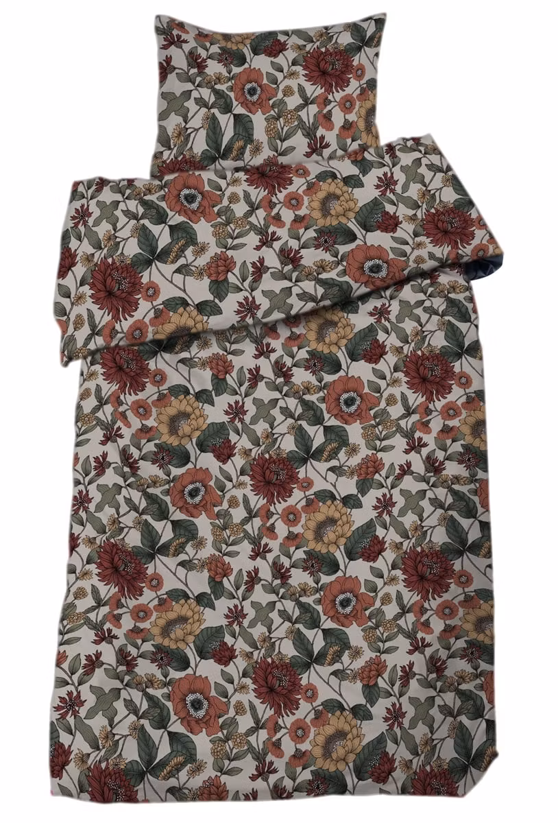 Dahlia Linne bäddset från Redlunds är ett levande och samtidigt harmoniskt bäddset som förvandlar sovrummet till en varm och inbjudande plats. Det vackra motivet med olika sorters dahlior och blad är formgivet av svensk designer och skapar ett balanserat samspel mellan färg och form. De dova nyanserna av gult, orange och rött mot den linnetonade botten ger sängen ett mjukt men uttrycksfullt utseende som snabbt blir rummets naturliga blickfång.