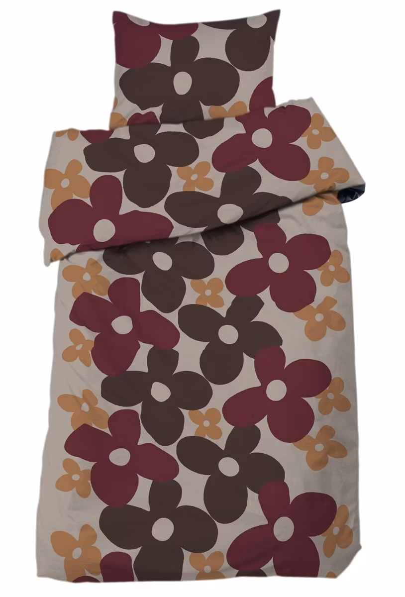 De stiliserade blommorna ger bäddsetet ett uttrycksfullt och glatt utseende som piggar upp rummet året om. Färgkombinationen av brunt, vinrött och beige med inslag av senapsgult skapar en balanserad helhet som känns både trendig och hemtrevlig. Ett perfekt val för dig som vill att sängen ska bli rummets naturliga blickfång.