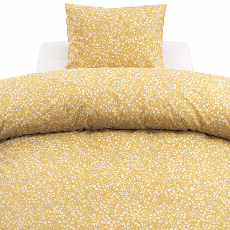 Hedda kombinerar en klassisk blommig design med en modern färgpalett. Den solgula bottenfärgen ger en varm, uppiggande känsla, medan de små vita blommorna tillför ett elegant och mjukt uttryck. Bäddsetet blir ett vackert blickfång i sovrummet och passar lika bra i lantliga som i moderna miljöer.