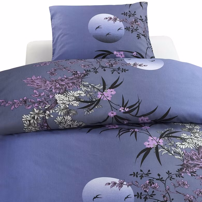 Skapa en drömlik och rogivande stämning i sovrummet med Japan Grå bäddset från Borganäs of Sweden. Mönstret är inspirerat av Japans vackra natur, med detaljerade japanska blommor i vitt och lilarosa och en drömlik måne i bakgrunden. Den grå bottenfärgen med lila undertoner ger en mjuk och elegant känsla som passar perfekt för dig som vill ha ett mer harmoniskt och estetiskt uttryck i ditt sovrum.