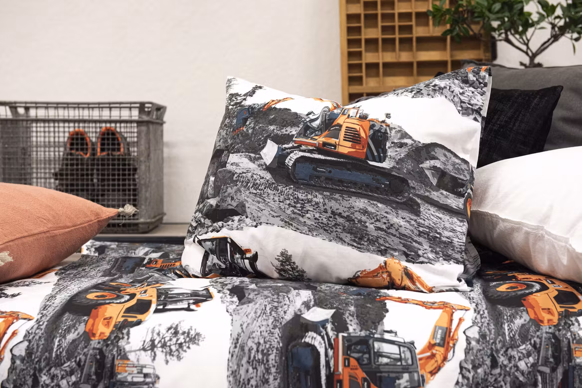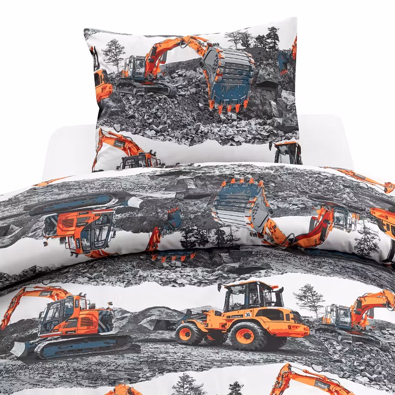 De tydliga fordonen och de pigga färgerna gör detta bäddset till ett roligt och dekorativt inslag i barnrummet. Designen är både lekfull och stilren, vilket gör att det passar i de flesta inredningsstilar. Kombinationen av orangea grävmaskiner mot ljus bakgrund skapar ett kontrasterande, fantasifullt och energigivande uttryck som barn älskar.