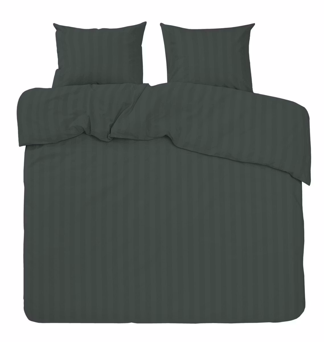 Den mjuka satinkvaliteten, den dova gröna färgen och det eleganta randmönstret skapar en harmonisk och lyxig sovmiljö.
