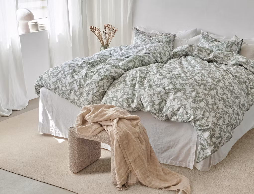 Pomegranate Grön kännetecknas av sitt grafiska och lekfulla mönster som ger sovrummet ett nytt och levande uttryck. De gröna granatäpplena skapar en naturnära känsla, medan den vita bottenfärgen bidrar till ett ljust och luftigt helhetsintryck som är lätt att matcha med olika inredningsstilar.