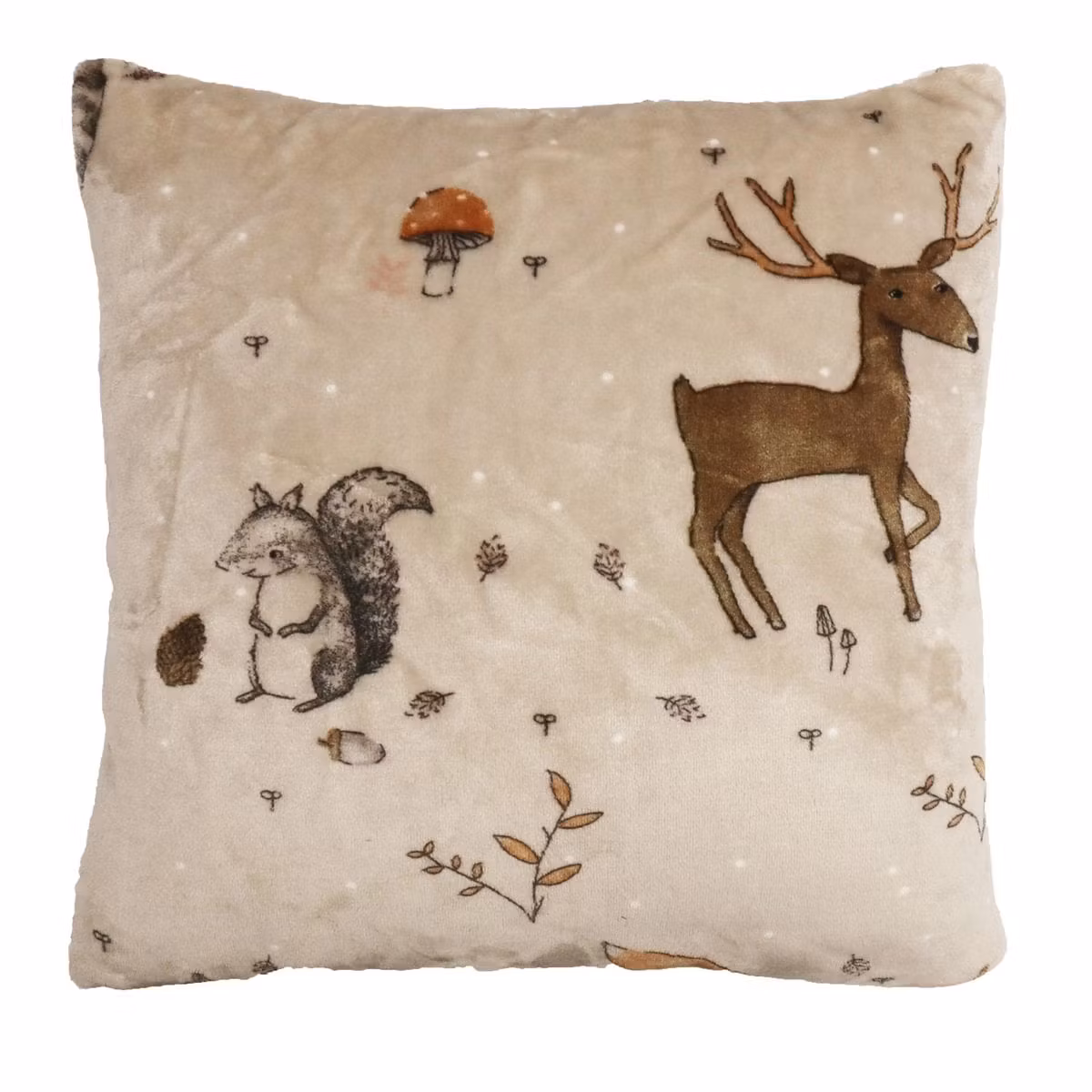 Detta charmiga kuddfodral pryds av söta djurmotiv – kaniner, hjortar och tvättbjörnar – mot en mjuk beige (linnefärgad) botten, vilket ger en lugn och naturlig känsla i rummet.