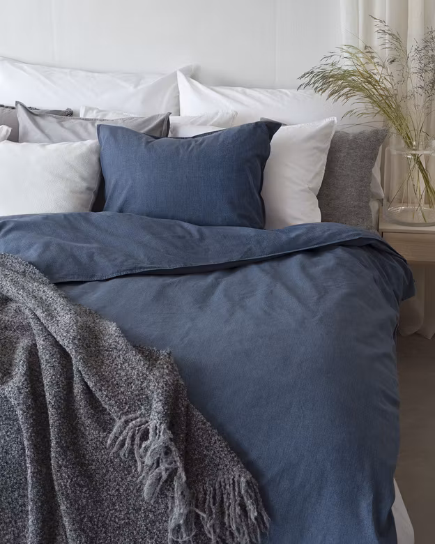 Ge ditt sovrum en modern och harmonisk atmosfär med Washed Marin Bäddset från Borganäs of Sweden.